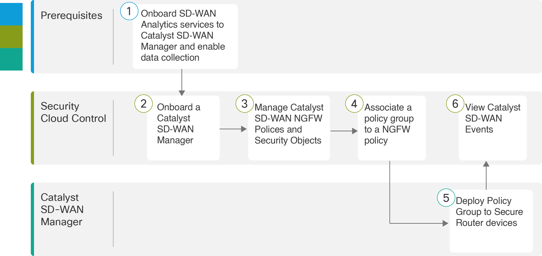 The following flowchart illustrates the high-level workflow for managing the firewall capabilities of Catalyst SD-WAN Manager using the Security Cloud Control.